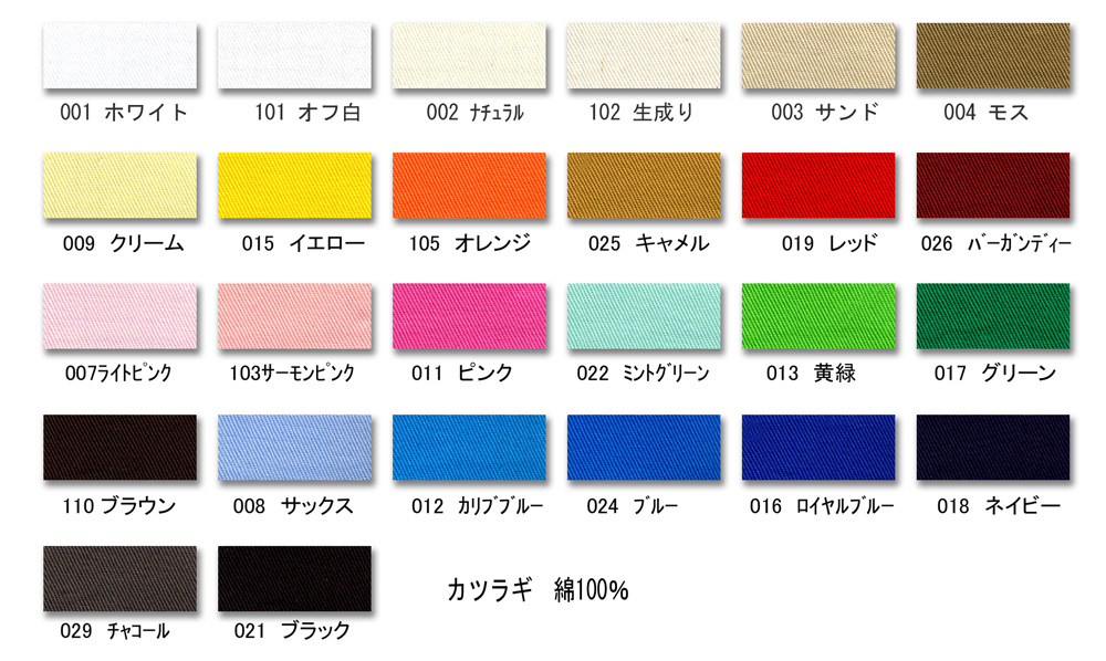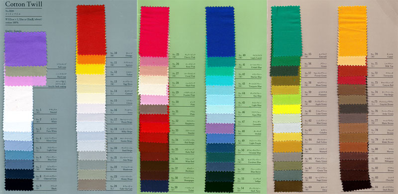 斜めの畝模様が特徴のチョット厚めの綿素材です。強度があるために作業着やツナギの素材として使われる事が多い