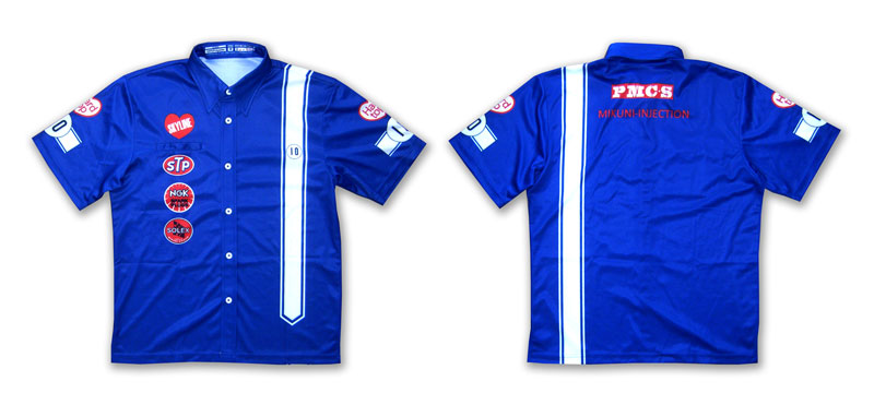| 広川モーター様のピットシャツはポリエステル100%ペトロマット素材に全面フルカラープリント、 フロントはフルオープンファスナー仕様で製作しました。 |