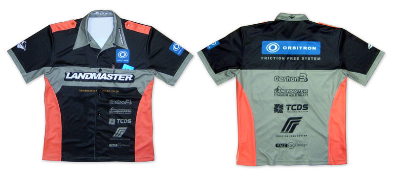 | ユニフォーム用にピットシャツを作らせていただきました。 ポリエステル100%ハードメッシュ、280gの光沢素材にフルカラープリント、ショルダー部分には肩章を付けています。。 |