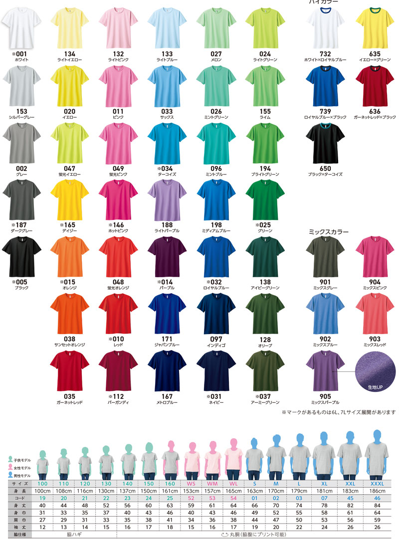 | サイズ | JrS | JrM | JrL | SS | S | M | L | LL | 3L | 4L | 5L | 素 材 | T/C 65/35 |