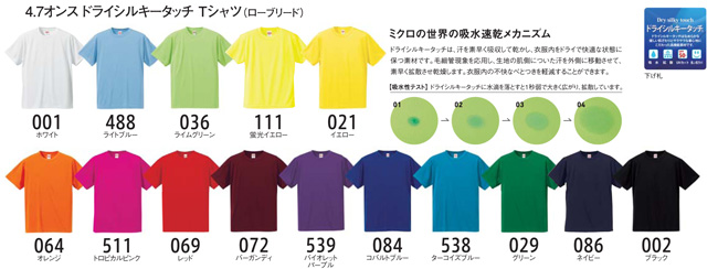 | カラー | 50 色 18サイズ | 吸汗性と速乾性に優れた機能を発揮するポリエス テル・メッシュ素材を使用して作られたTシャツは汗 のベタ付きを押さえます。 |