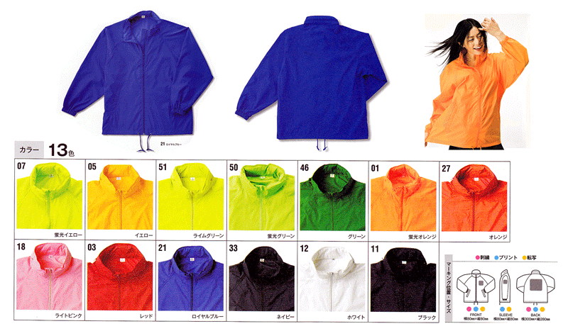 | 特 徴 | 気候の変化に対応できるフード付きウィンドブレーカーは異形糸で光が反射、イベントには最適です。 | ||||