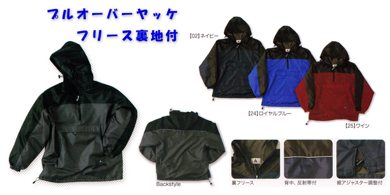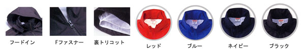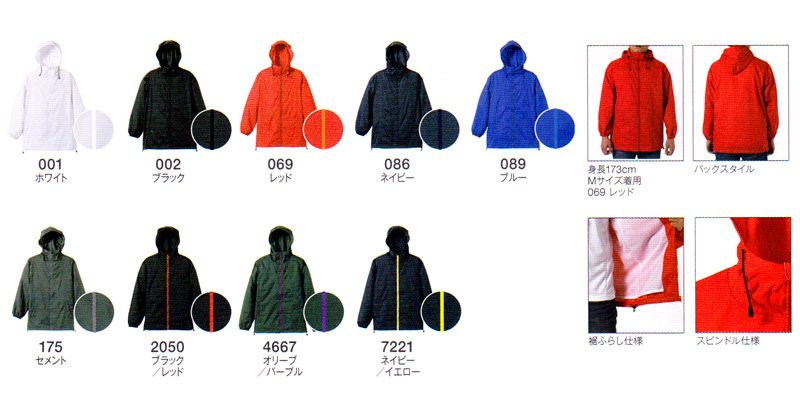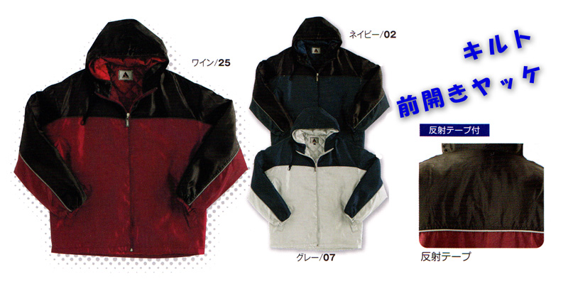 | 特 徴 | フード付で撥水素材仕様でサイズも色も豊富、キルティング裏地が付いた保温性のあるヤッケですです。 | |||||||